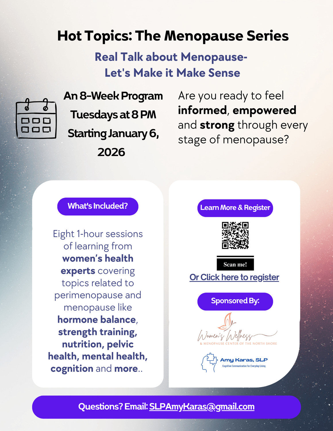 Cognitive-communication changes during menopause such as brain fog, reduced focus, or word-finding difficulty are common and often linked to hormonal shifts. Speech-language therapy can help by offering practical strategies to boost clarity, attention, memory, and overall cognitive confidence throughout the menopausal transition.